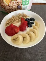Fibeeボール アサイーボールとか流行ってますがとか流行って意外に高いので、アサイーって意外に高いので、Fibeeのグラノーラで、和風のFibeeボール作ってみました。ヨーグルトと粒あんとみたらしダレかけて食べました。