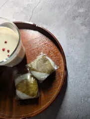 おやつ ルイボスティー、豆乳で割りました。桜もちと。