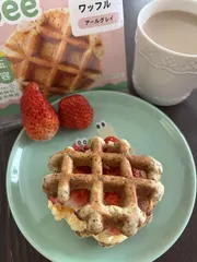 おやつにワッフルアイスサンド🧇🍨 今日のおやつは、ワッフルアイスサンド🧇🍨ワッフルアールグレイを半分にカットして、アイスクリームといちごを挟んでみました🍓サンドするのが難しい💦アイス溶け溶けになってしまった😅