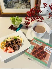 むぎゅっとワッフルココア 仕事の休憩時間にいただきました✨このむぎゅっと、中身がつまってるのにふわっとしてるような食感が大好きです!皆さんの投稿のように何か挟んだり、添えたり、アレンジもいつかしてみたいです♪