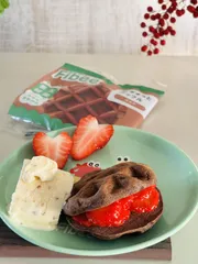 ココアWのハーモニー🧇 朝食に、ワッフル🧇ココアを食べました。コーヒーではなく珍しく朝からココアオレ(粉末)にしました♪ココアにも、バナナにも、イチゴにも食物繊維豊富な朝メニューに。に分トースターで焼いてから、切りました