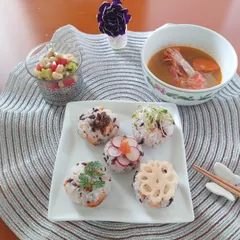お昼ごはん 簡単ブイヤベース、大豆のサラダ、手まり寿司を作りました😋