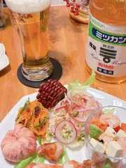 「にんじんとピーマンののラペ」と「エビアボカドとまと」に穀物酢を使ったメニュー。お酢たっぷり補給で腸活を願ってかぼちゃキノコのスープも♪